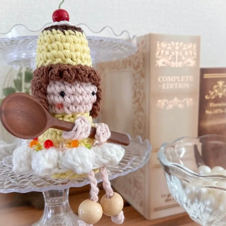 ホイップクリームをイメージしたポコポコのスカート♪カラフルなビーズはミカンやキュウイ、桃などのフルーツを表現しています。大きな木のスプーンを持って、おいしく食べてもらえる日を待っています(*⁰▿⁰*)