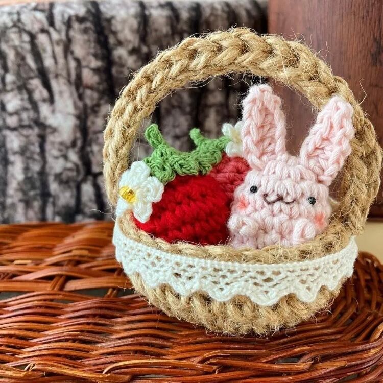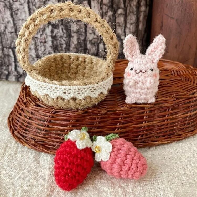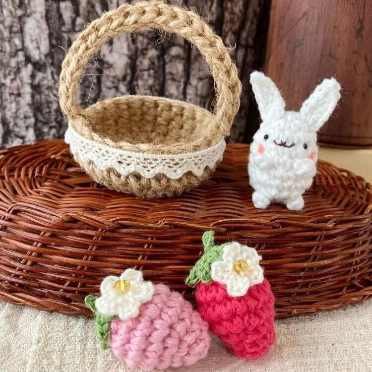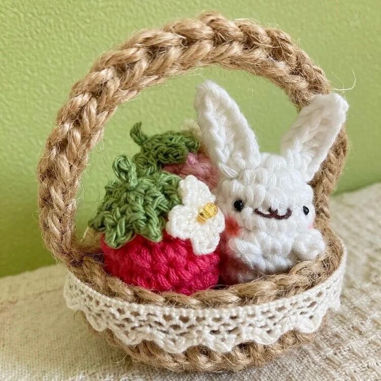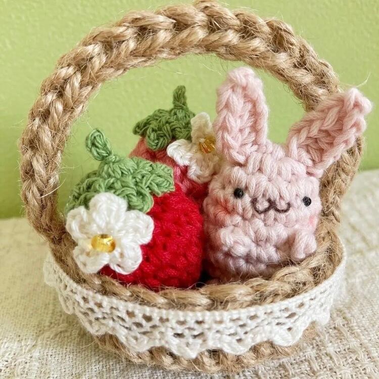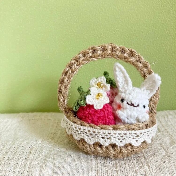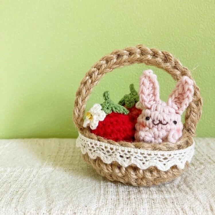 こちらの作品は、豆うさぎちゃん1体といちご2粒と麻かごのセットです。